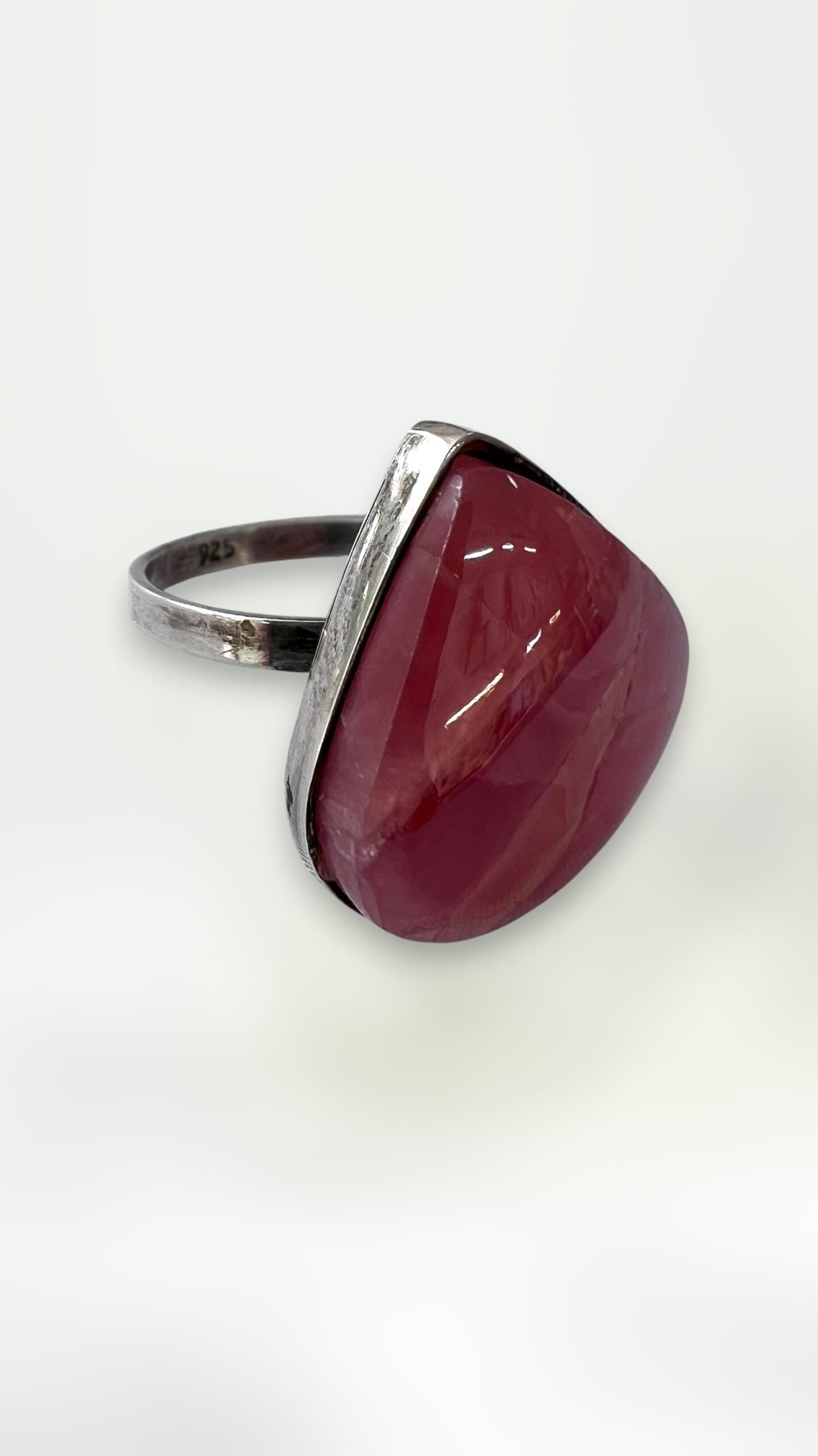 Un anillo delicado y sofisticado donde la rodocrosita Ortiz se presenta en una elegante forma de gota, con tonos rosados intensos y vetas blancas perfectamente definidas que forman capas naturales, creando un diseño profundo, armónico e irrepetible. Su superficie, con un pulido impecable y acabado fino, refleja la luz con una suavidad cautivante, destacando la calidad excepcional de la gema.