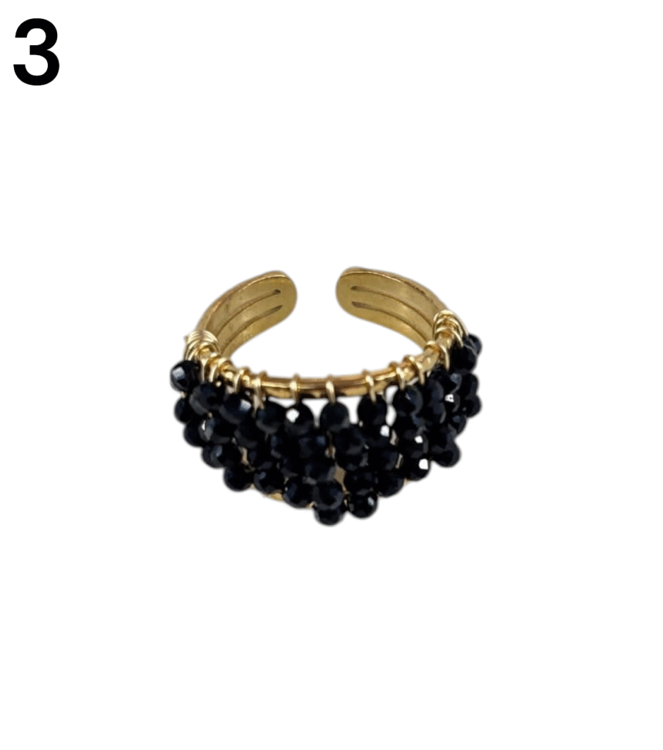 Estos anillos son de acero dorado con chispitas de piedras tejidos. Son regulables.