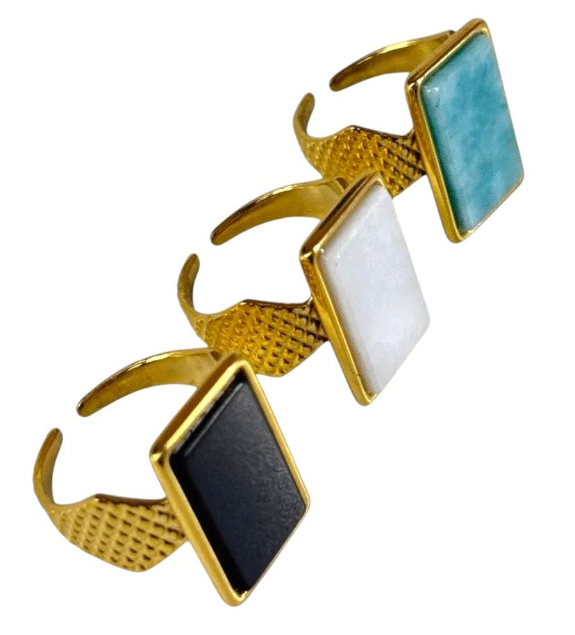 • Anillos de acero dorado, regulables con importante piedra central rectangular.