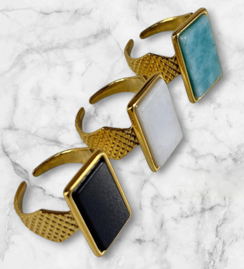 La estructura dorada, de acabado pulido, envuelve delicadamente la piedra, realzando su color y profundidad. Ya sea cuarzo, circonia o una piedra natural, cada anillo está pensado para ofrecer estilo con durabilidad, ideal para el uso diario o para complementar atuendos especiales.