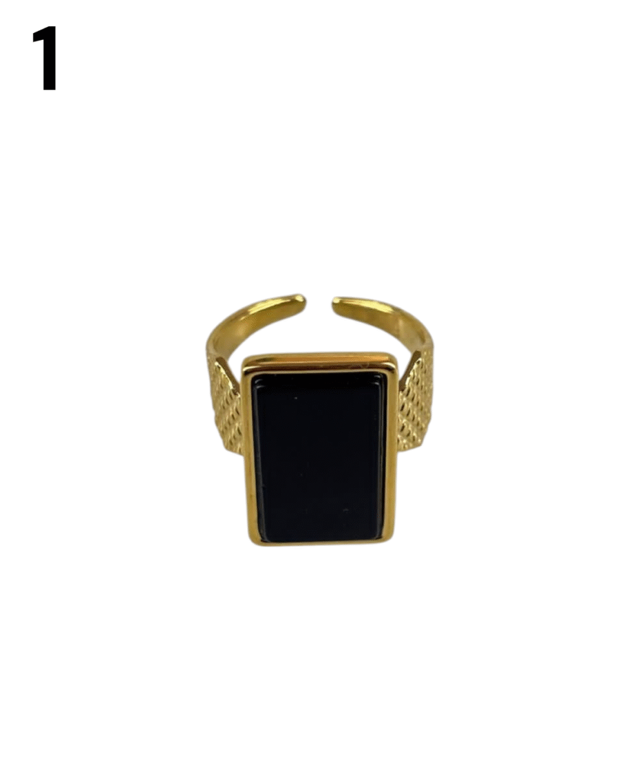 - Anillos de acero dorado, regulables con importante piedra central rectangular.