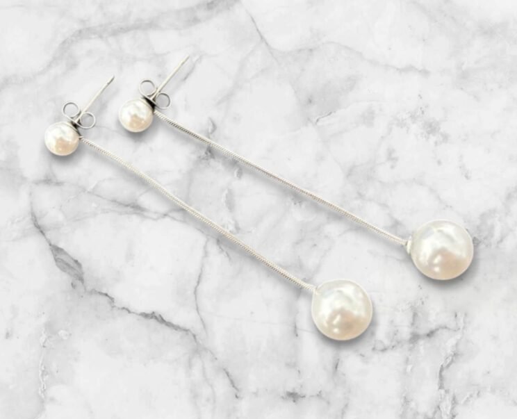 Aro largo con perla, combina líneas delicadas con un diseño minimalista que alarga visualmente el rostro y aporta un toque de sofisticación sutil, colgando suavemente al final, agrega un brillo clásico y femenino que nunca pasa de moda.