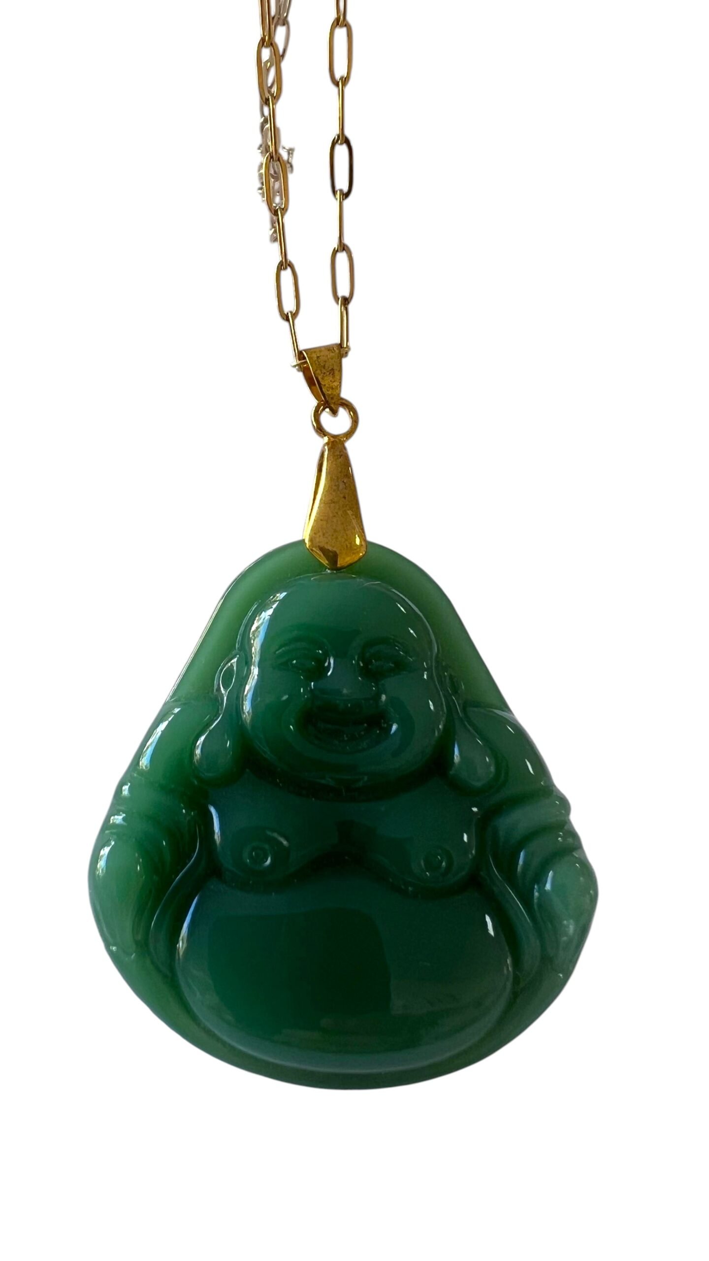 Un collar con fuerte presencia y detalle donde el cuarzo verde se presenta en una talla de Buda cuidadosamente definida, destacando rasgos suaves y expresivos en el rostro, con líneas delicadas que aportan profundidad y carácter a la pieza. La superficie de la piedra está pulida con brillo y acabado fino, permitiendo que la luz resalte cada relieve del tallado.