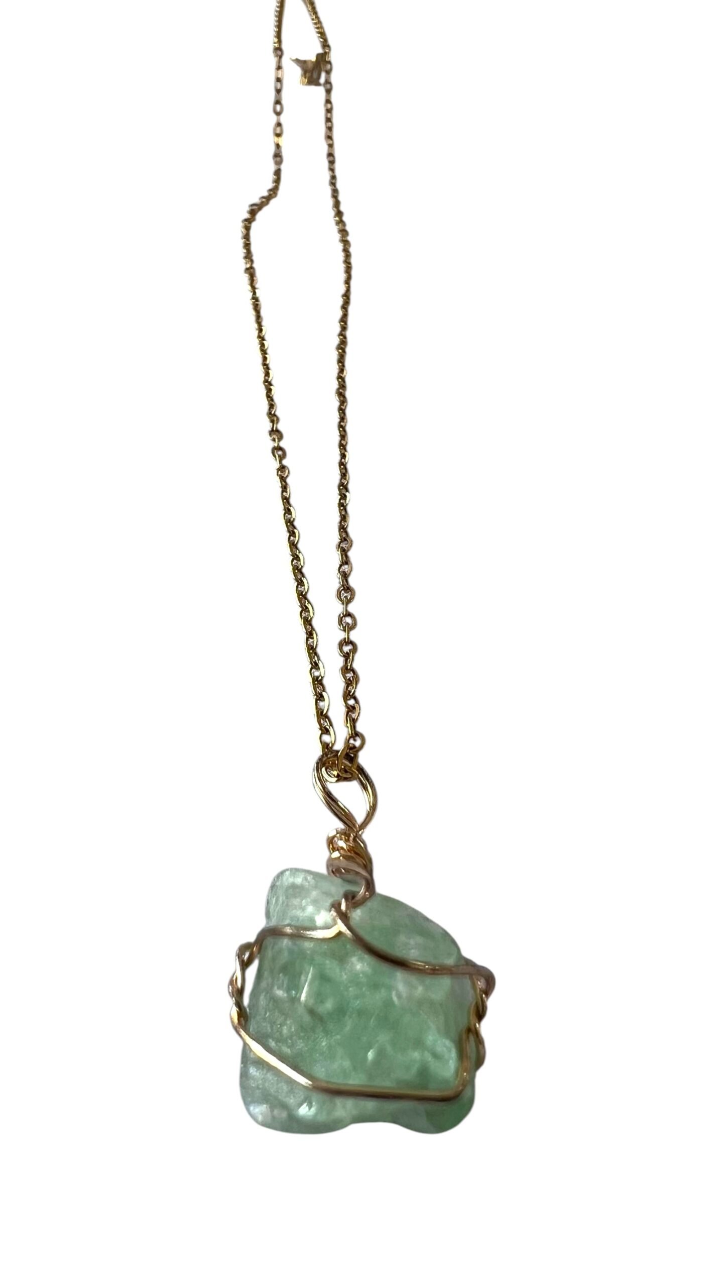 Un collar de carácter auténtico que destaca la belleza del cuarzo verde natural en estado bruto, conservando su forma orgánica y esencia original.