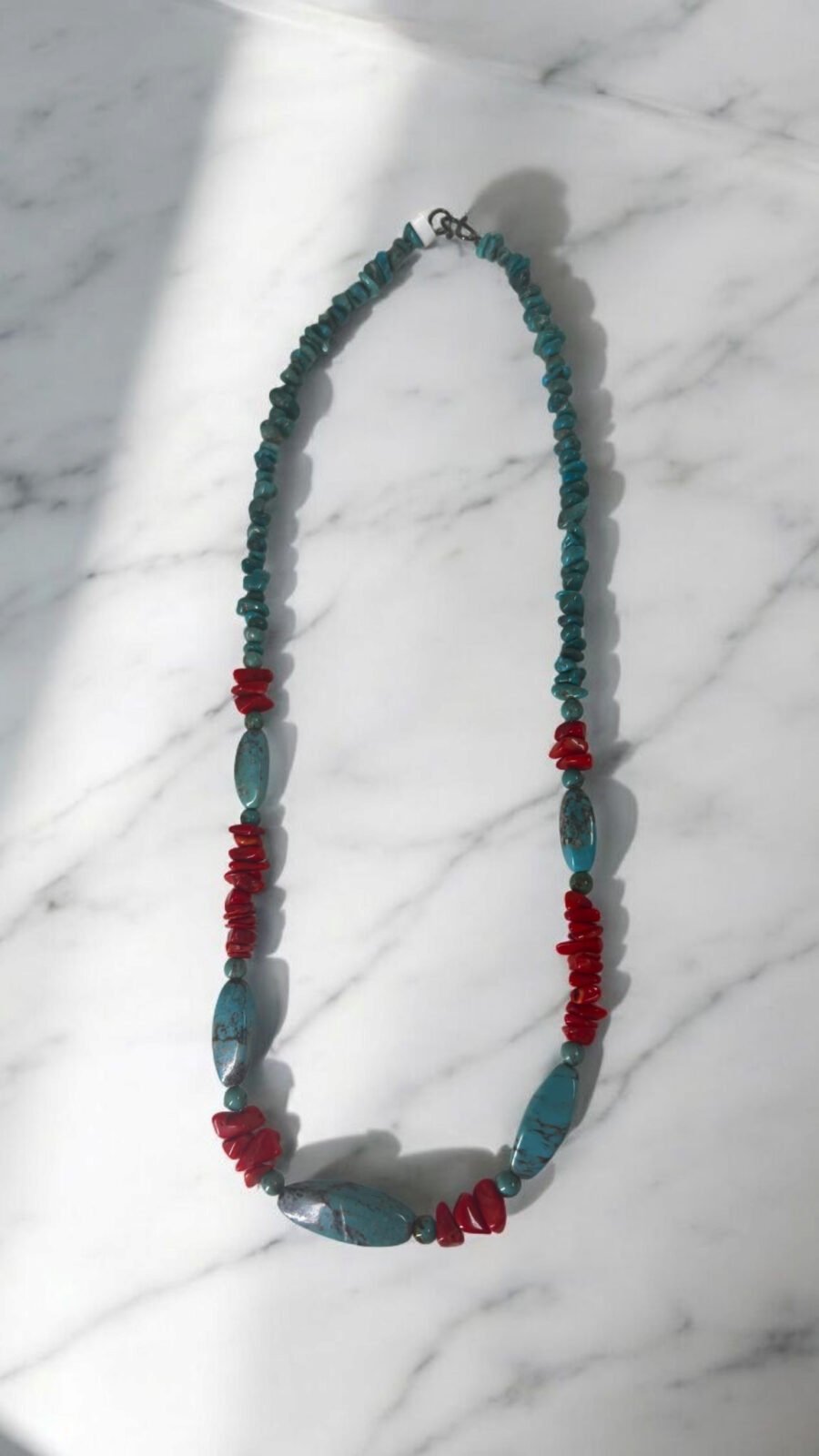 Este hermoso collar de turquesa y coral fusiona la energía tranquila del mar con la fuerza vibrante de la tierra. Hecho a mano con piedras naturales, es una pieza cargada de significado y presencia.