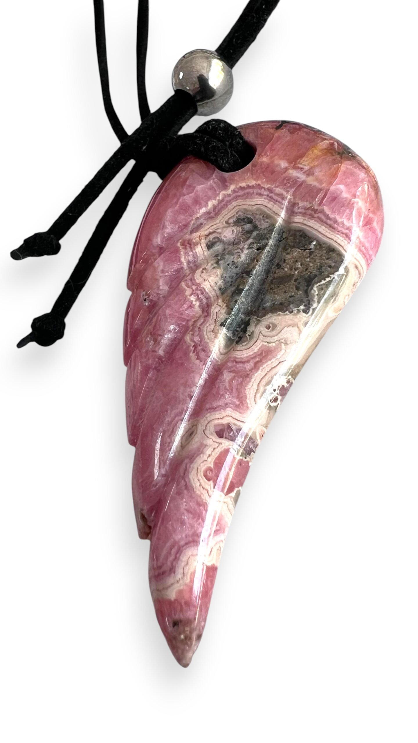 Un dije profundamente simbólico y delicado donde la rodocrosita ha sido tallada en forma de alita de ángel, transmitiendo una sensación de suavidad, protección y conexión espiritual. La piedra revela tonos rosados intensos y suaves, acompañados por vetas blancas y matices naturales que forman paisajes únicos en su interior, incluyendo detalles más profundos que realzan su carácter auténtico. Su superficie, con un pulido impecable y acabado fino, refleja la luz con un brillo suave y envolvente.