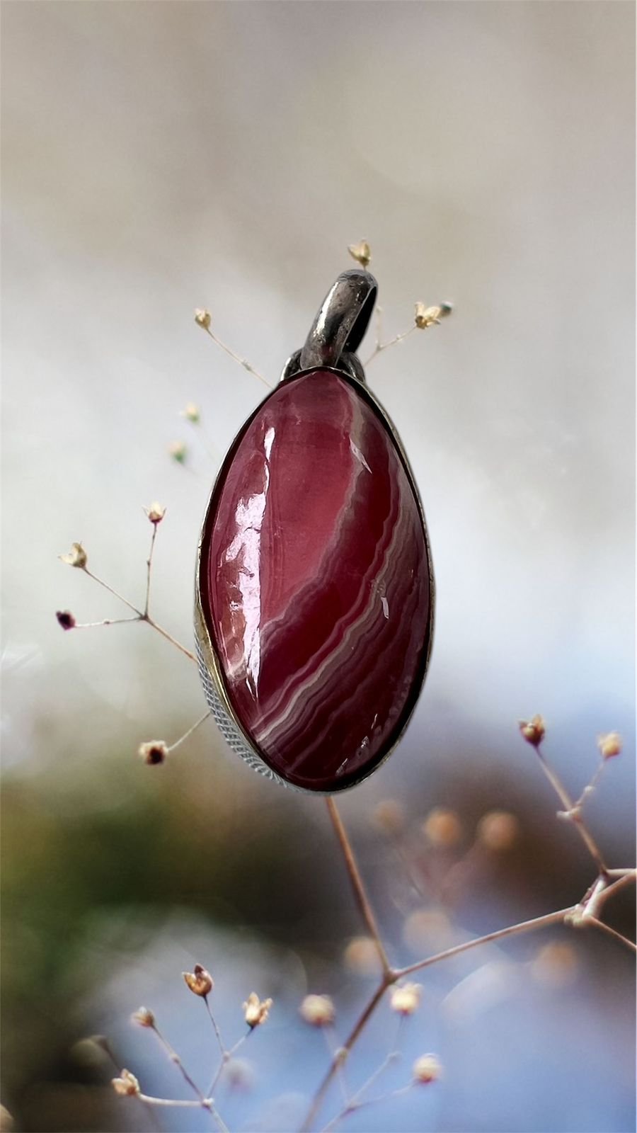 La piedra se presenta en un formato ovalado, con una superficie perfectamente pulida que refleja la luz con un brillo suave y seductor. Sus tonos rojos intensos se entrelazan con delicadas vetas blancas y rosadas en formas onduladas, creando un efecto visual armonioso y natural, como capas que cuentan su historia. Cada detalle resalta su calidad superior, siendo una gema fina, cuidadosamente trabajada a mano y en plata 925 para realzar toda su belleza.