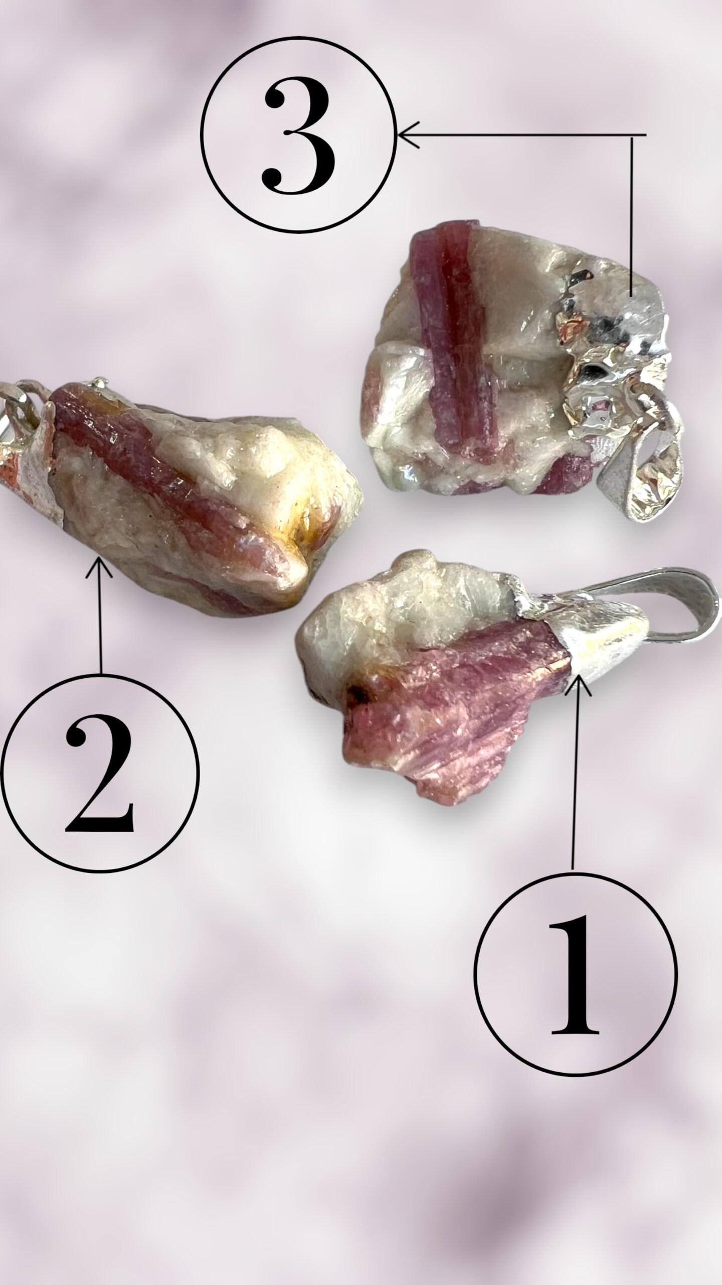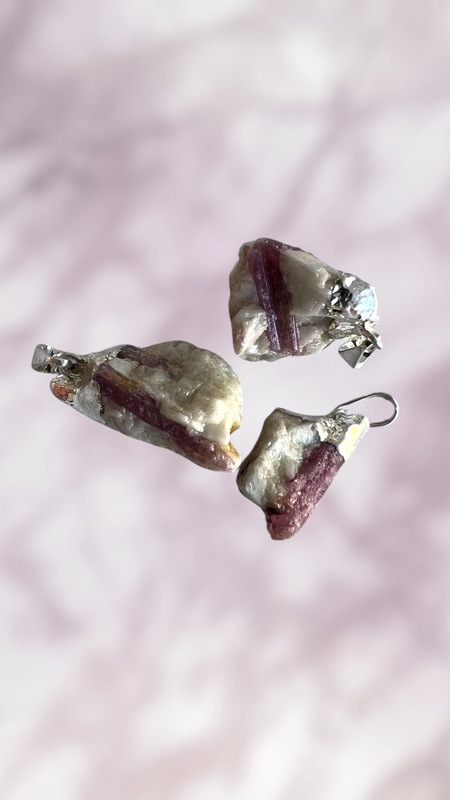 Un set delicado y natural donde la turmalina rosa se presenta en tres piezas individuales, cada una con su propia forma y carácter.