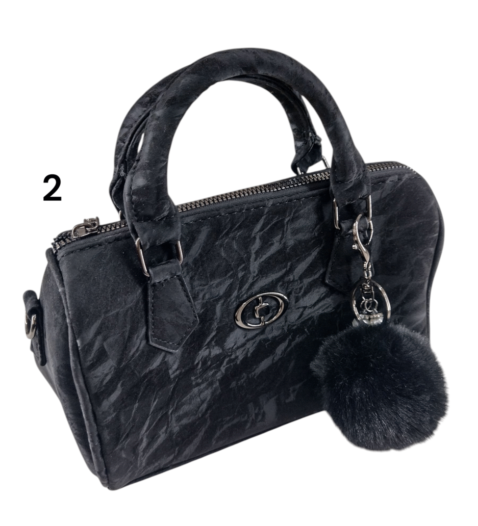 La mini bag negra de terciopelo que combina elegancia y practicidad. Su textura suave y su brillo sutil capturan la luz con cada movimiento, comvirtiendola en la compañera perfecta para esas noches en que quieres brillar sin esfuezo.