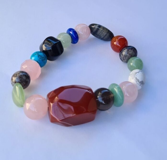 Esta pulsera no solo destaca visualmente por el tamaño y presencia de sus piedras, sino también por la poderosa carga energética que cada una de ellas transmite, convirtiéndola en un amuleto completo para armonizar cuerpo, mente y espíritu.