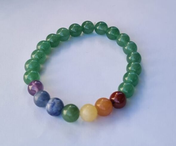 La pulsera de los 7 chakras sirve para activar y equilibrar los centros de energía (chakras) del cuerpo, con el objetivo de promover un mayor bienestar físico, emocional y espiritual. Al alinear estos centros de energía a lo largo del eje central del cuerpo, la pulsera busca mejorar la armonía, la paz interior y la fluidez vibratoria personal, utilizando diferentes piedras semipreciosas que se asocian a cada uno de los chakras.