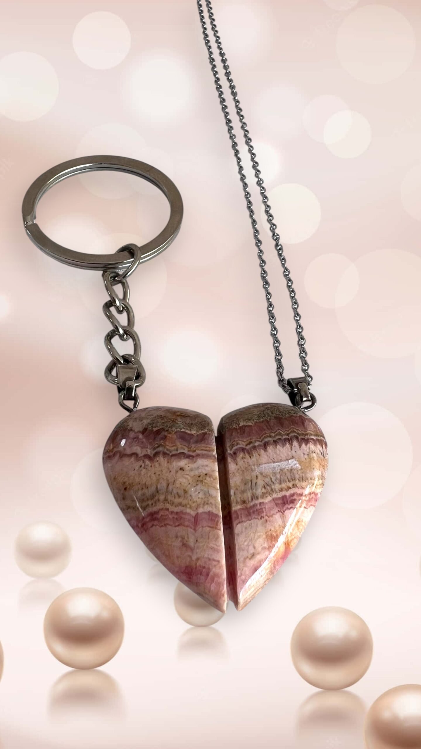 Un set dulce y significativo donde la rodocrosita se presenta en delicadas formas de corazón, pensadas para acompañarte todos los días. Cada piedra revela tonos rosados suaves e intensos, combinados con vetas blancas naturales que forman dibujos únicos e irrepetibles, convirtiendo cada llavero en una pieza especial. Su superficie, con pulido suave y acabado fino, refleja la luz con una calidez encantadora.