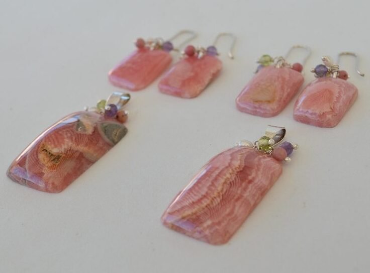 Este encantador set está compuesto por piezas de auténtica rodocrosita argentina, cuidadosamente engarzadas en plata 925. La piedra se presenta con su característico tono rosa, acompañado por un delicado detalle de «chispita», un toque mineral brillante que realza la belleza natural de cada pieza y aporta un efecto visual único.